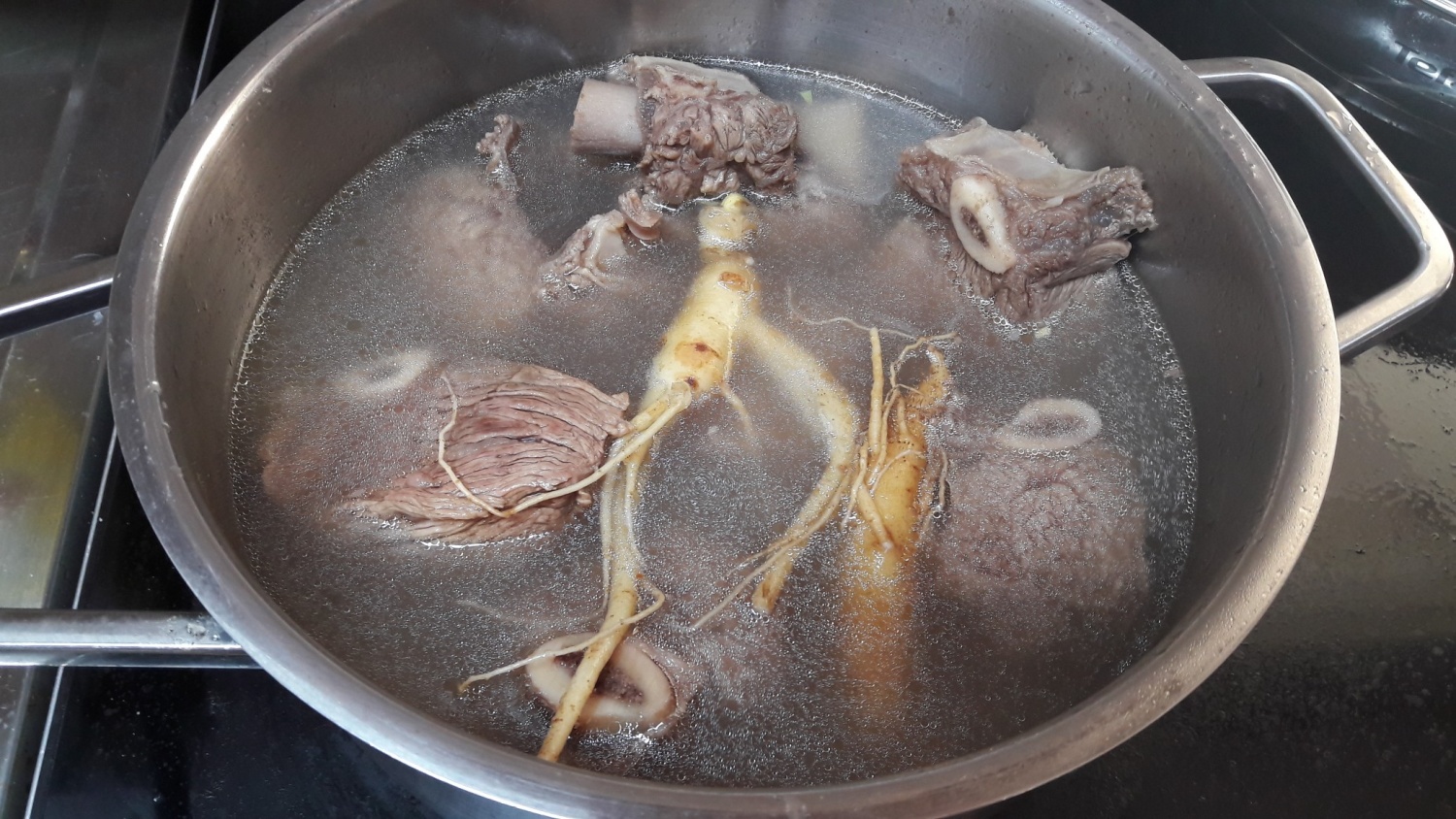 Sekarang, mari siapkan kaldu sayuran untuk dasar rasa yang kaya dan mendalam. Dalam panci, tambahkan air secukupnya hingga iga terendam seluruhnya (sekitar dua kali volume iga). Masukkan 1/5 lobak putih, 1 batang daun bawang, 3 sdm bawang putih utuh, 2-3 akar ginseng, dan sedikit jahe. Didihkan dan masak dengan api besar selama 15 menit untuk mengekstrak rasa. Setelah 15 menit, angkat akar ginseng secara terpisah. Saring kaldu untuk mendapatkan cairan bening, buang sayuran dan bawang putih.