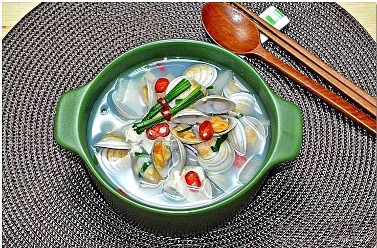 Masukkan lobak yang sudah diiris ke dalam kuah kerang yang sudah disiapkan dan didihkan hingga lobak sedikit bening. Setelah lobak lunak, tambahkan kerang yang sudah direbus dan masak bersama agar sari kerang yang menyegarkan meresap ke dalam kuah.