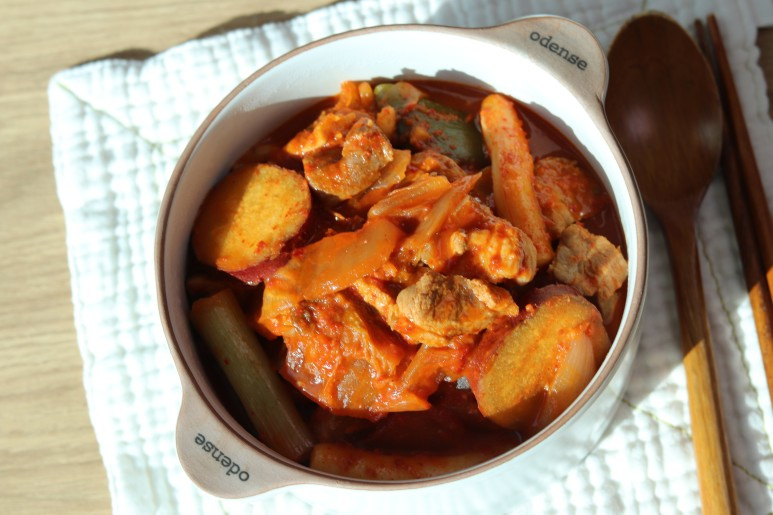 Sekarang saatnya menyusun bahan-bahan di dalam panci. Mulai dengan meletakkan irisan bawang bombay tebal di dasar panci. Susun irisan daging babi di atasnya, diikuti dengan kimchi (keluarkan sedikit bijinya dan potong kasar). Terakhir, ratakan kue beras tteokbokki dan irisan ubi jalar yang sudah disiapkan.