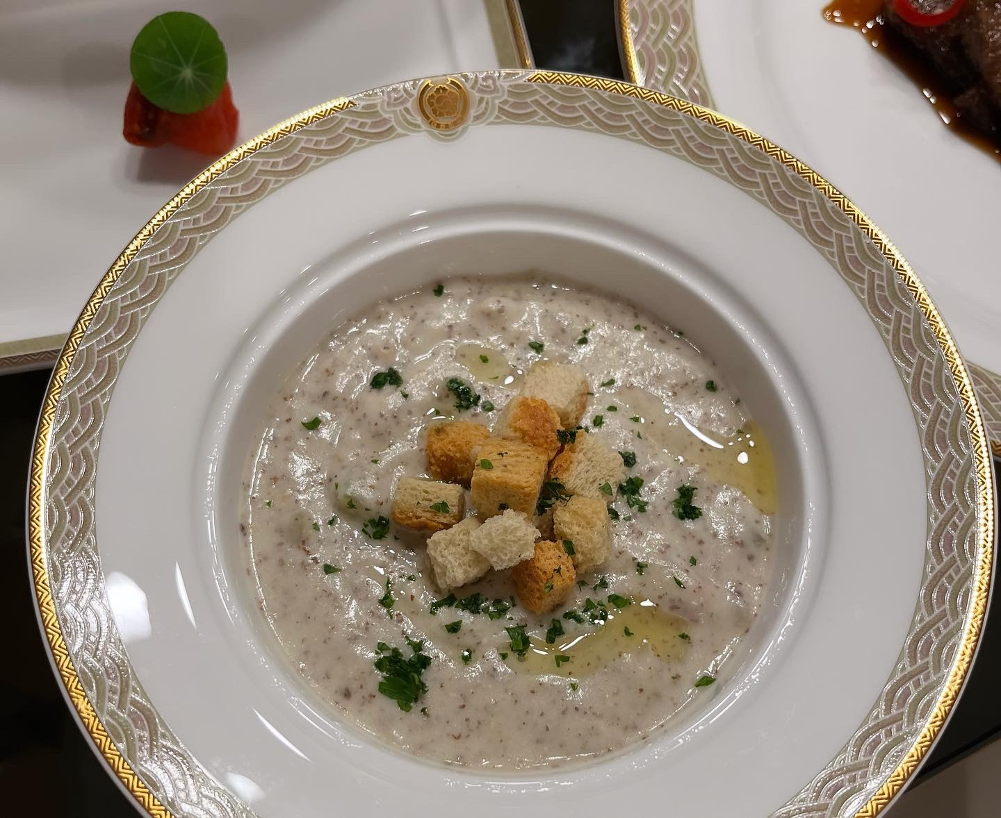 Masak hingga sup mencapai konsistensi yang sangat kental namun masih bisa dituang. Sajikan sekitar 180ml sup ke dalam setiap mangkuk saji. Terakhir, hiasi dengan taburan roti panggang kering, sejumput bubuk biji perilla, sedikit minyak zaitun, dan peterseli segar cincang halus. Sajikan segera dan nikmati sup krim kerang dengan rasa yang unik ini.