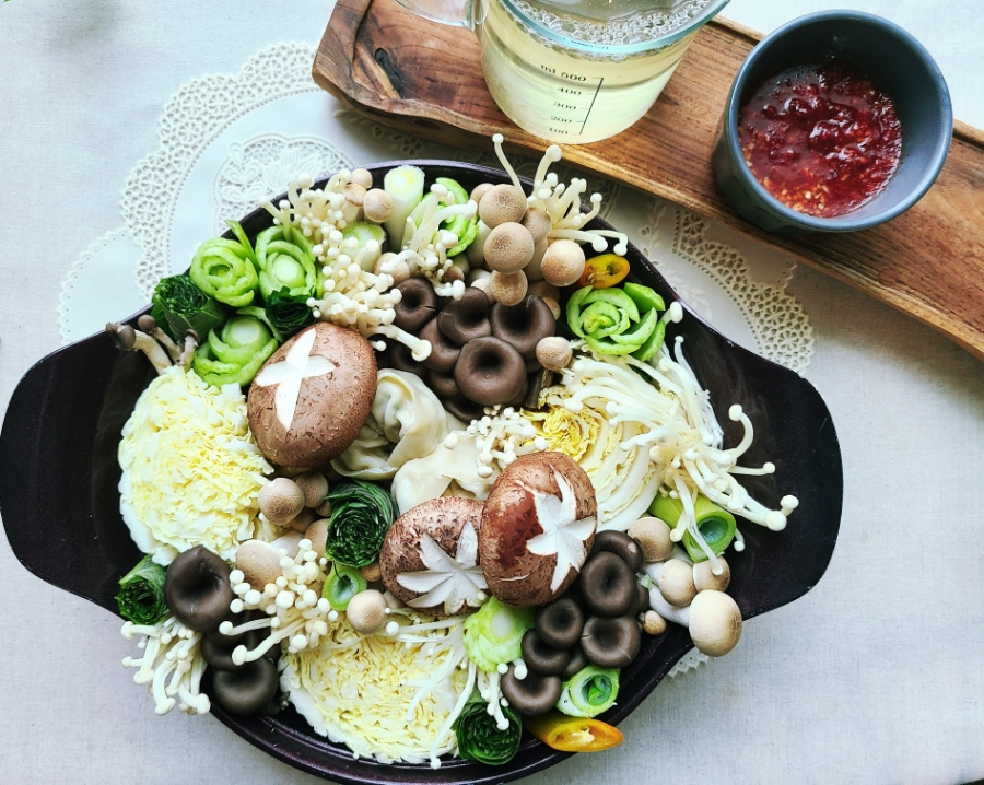 Bersiaplah untuk terpukau oleh presentasi yang memukau dan rasa yang lezat dari Sup Pang Jamur dan Pangsit ini! Perpaduan warna-warni aneka jamur dan sayuran segar ditata secara artistik dalam panci, siap direbus dalam kaldu ikan teri dan kombu yang kaya rasa. Cukup siapkan bumbu pedasnya, dan nikmati hidangan yang hangat dan nyaman langsung di meja Anda. Sangat cocok untuk menjamu tamu atau menambahkan sentuhan istimewa pada acara apa pun.