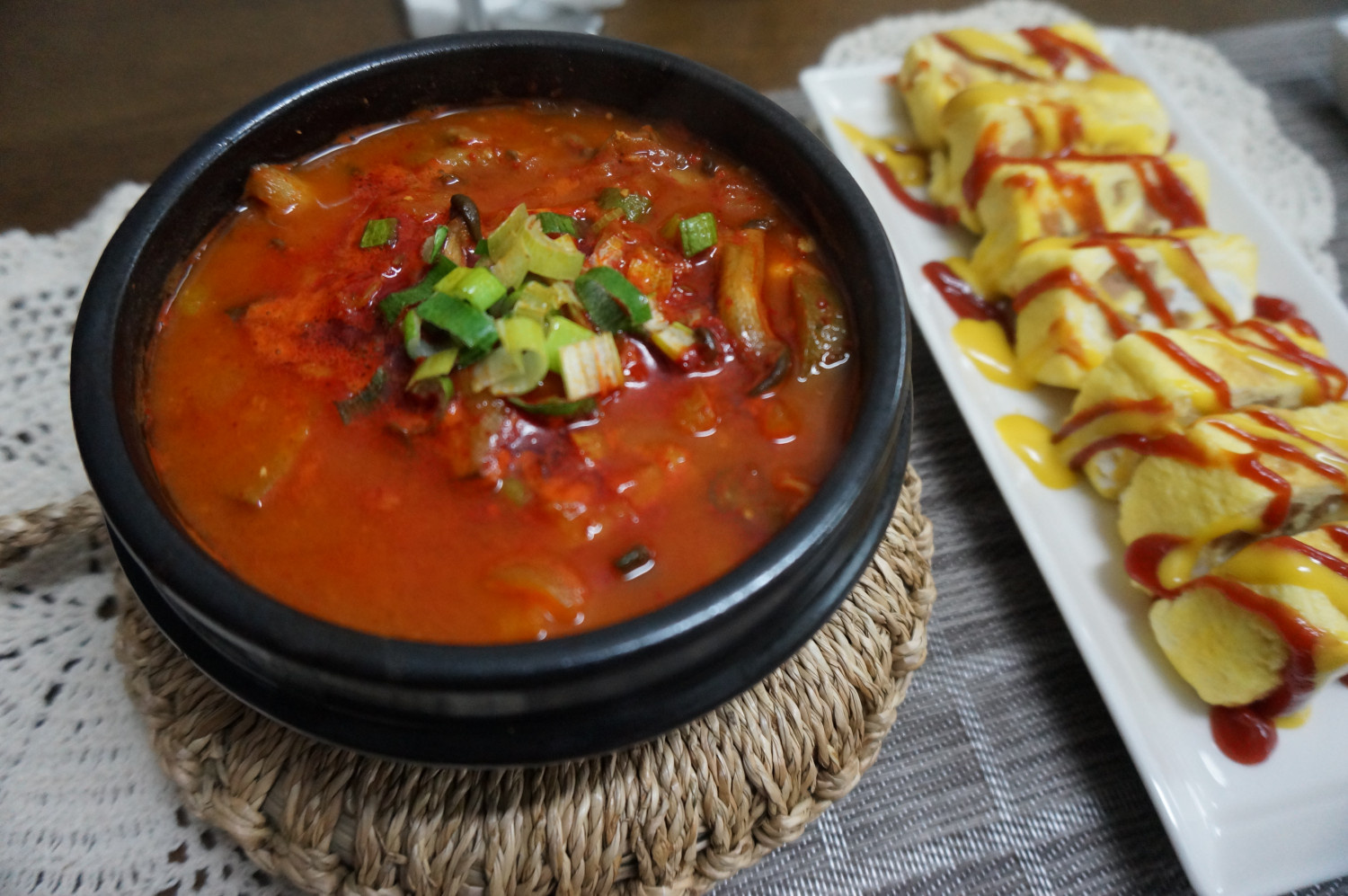 Terakhir, tambahkan tahu dan jamur yang sudah disiapkan. Kecilkan api menjadi kecil dan masak tanpa ditutup selama sekitar 5 menit lagi, biarkan semua bahan menjadi empuk dan rasa sup menyatu. Cicipi dan sesuaikan bumbu jika perlu, gunakan lebih banyak saeu-jeot atau guk-ganjang jika diperlukan.