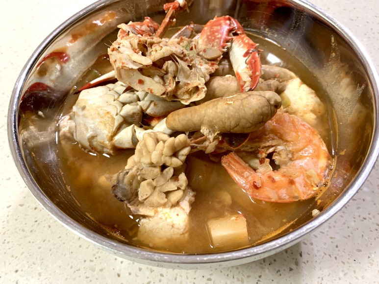 Terakhir, tambahkan cabai hijau Korea yang diiris diagonal dan didihkan sebentar lagi selama satu atau dua menit. Cabai menambahkan rasa pedas dan segar yang menyenangkan pada kaldu. Haemul Altang lezat Anda, yang menampilkan esensi gurih dari kepiting dan udang, rasa segar dari udang air tawar, dan tekstur lembut dari telur ikan dan jeroan, kini siap!