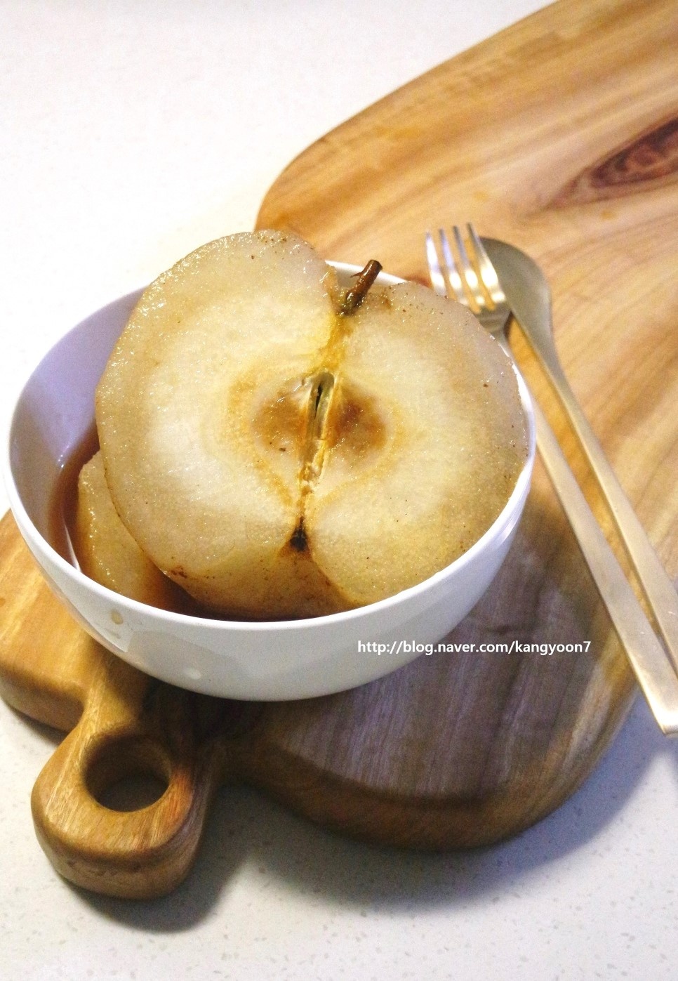 Pertama, kupas pir dan masukkan utuh ke dalam panci. Tambahkan anggur putih (atau soju), bubuk kayu manis, lada hitam utuh, dan air ke dalam panci. Tutup panci, didihkan dengan api sedang-tinggi, lalu kecilkan api. Biarkan mendidih perlahan selama kurang lebih 30 menit, agar rasa dan aroma pir meresap sempurna ke dalam kaldu.