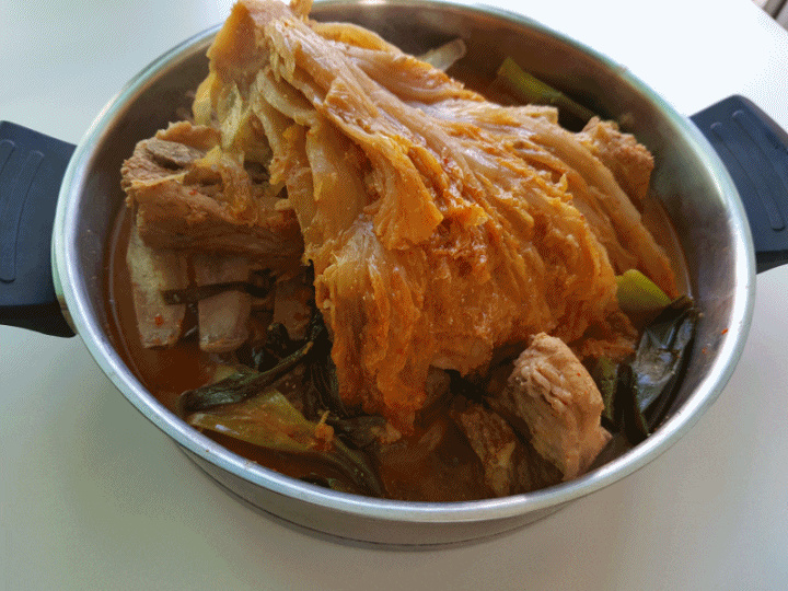 Setelah 30 menit lagi, punggung babi seharusnya sudah empuk dan mudah lepas dari tulang, dan kimchi seharusnya sudah lunak dan kaya rasa. Kuahnya akan berubah menjadi warna yang kaya dan menggugah selera.
