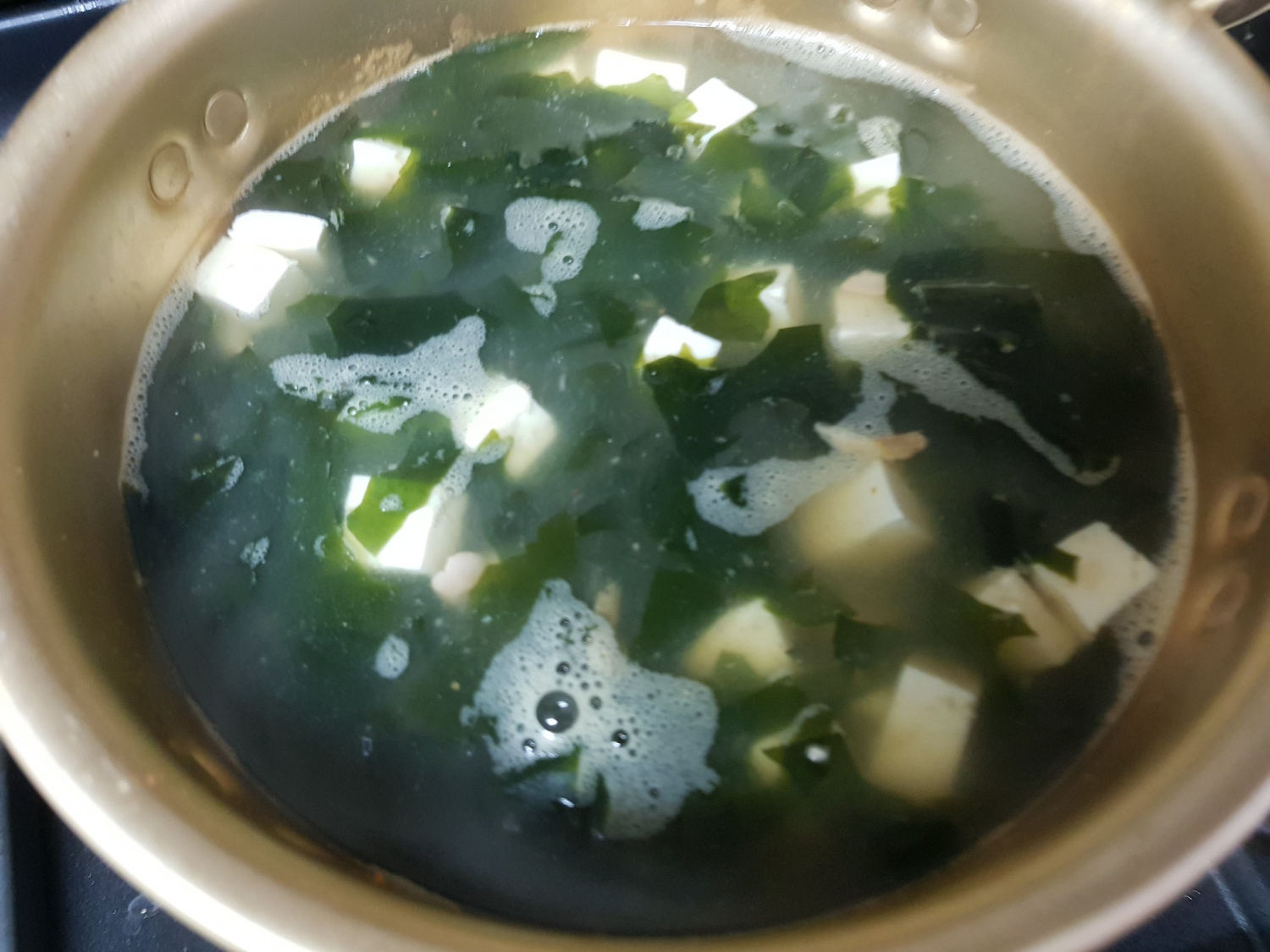 Sekarang saatnya menggabungkan semua bahan dan memasak! Masukkan rumput laut yang sudah direhidrasi dan tahu yang sudah dipotong dadu ke dalam kaldu miso. Didihkan dengan api besar. Setelah mendidih, kecilkan api ke sedang dan masak lagi selama 2-3 menit, biarkan rasa menyatu. Terakhir, bumbui dengan 1 sdm kecap asin kepiting merah (atau kecap asin Korea) sesuai selera. Jika menyiapkan untuk bayi, gunakan sedikit saja kecap asin atau bisa juga dihilangkan. Nikmati Sup Rumput Laut Tahu Miso yang lezat ini yang dapat dinikmati seluruh keluarga!