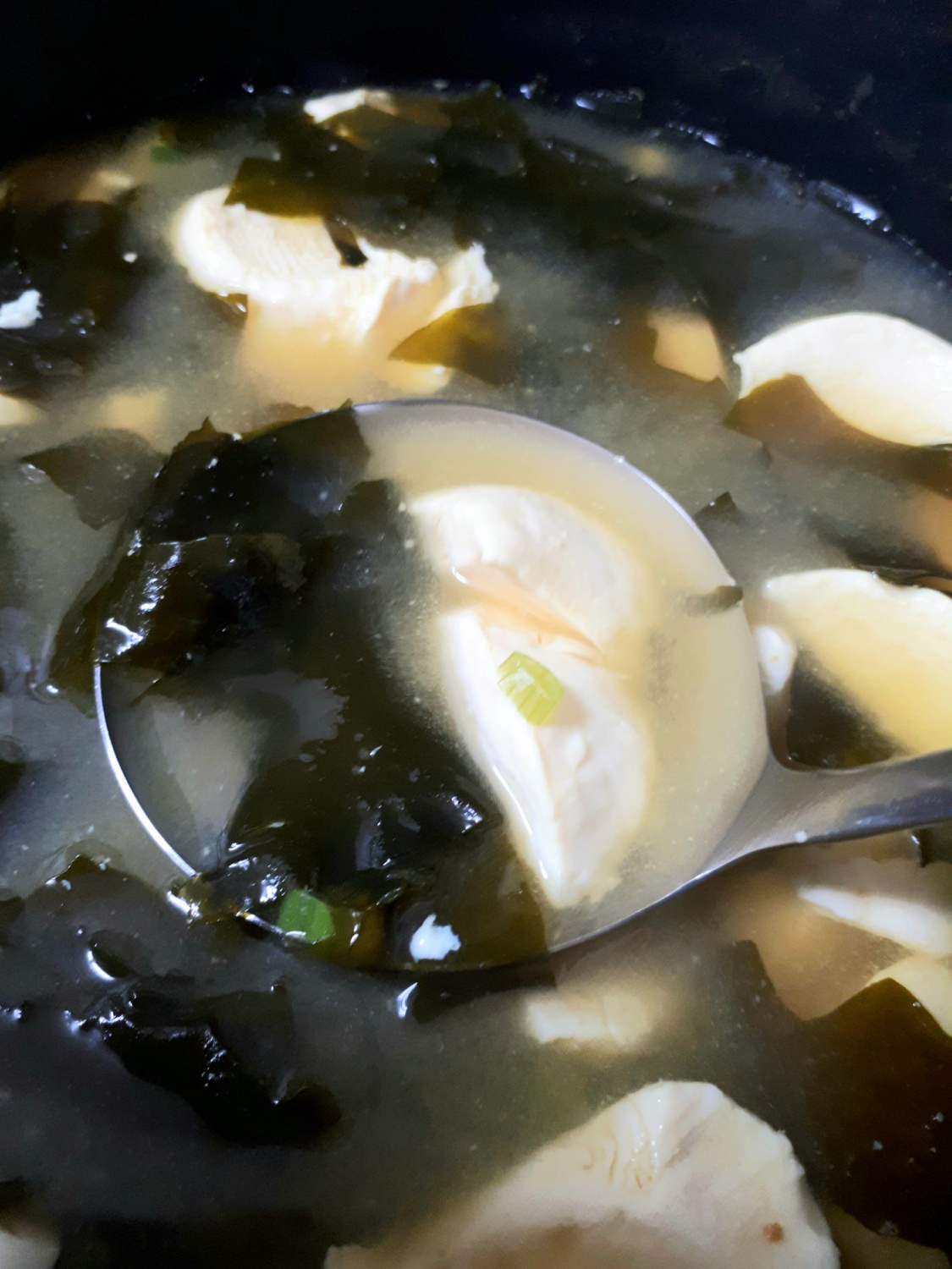 Setelah sup rumput laut dan doenjang dimasak selama 10 menit, masukkan 2 bungkus tahu sutra yang sudah dipecah-pecah menggunakan sendok. Taburkan sejumput lada hitam untuk menghilangkan bau amis. Cicipi sup dan tambahkan garam jika perlu untuk menyesuaikan rasa.
