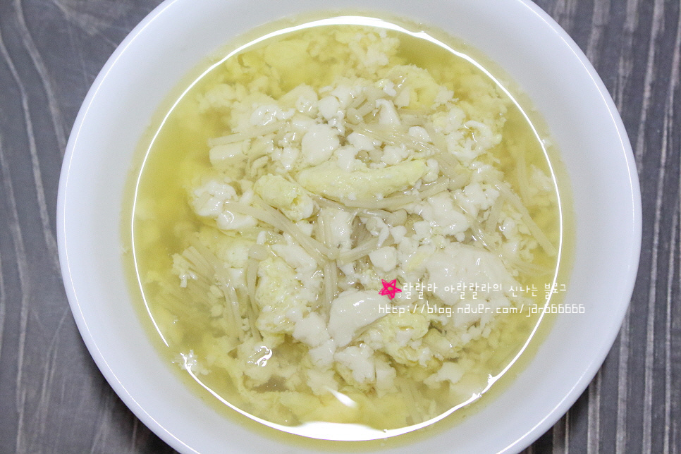 Hancurkan tahu sutra dengan lembut dan tambahkan ke dalam kaldu yang mendidih. Kemudian, tambahkan jamur enoki yang sudah disiapkan dan biarkan semuanya mendidih bersama. Berhati-hatilah agar tahu tidak terlalu hancur.