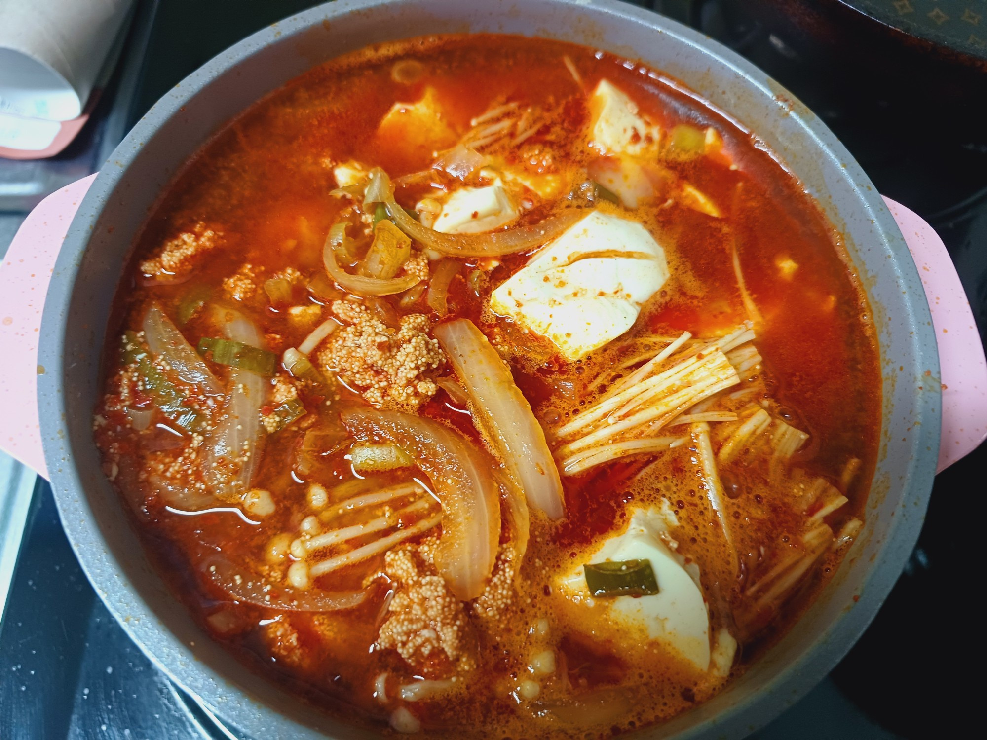 Setelah kuah mendidih dengan kuat, tambahkan telur ikan pollack yang sudah disiapkan dan tahu sutra yang sudah ditiriskan dengan hati-hati. Anda bisa memasukkan tahu sutra secara utuh atau memecahnya menjadi potongan-potongan kecil dengan sendok.