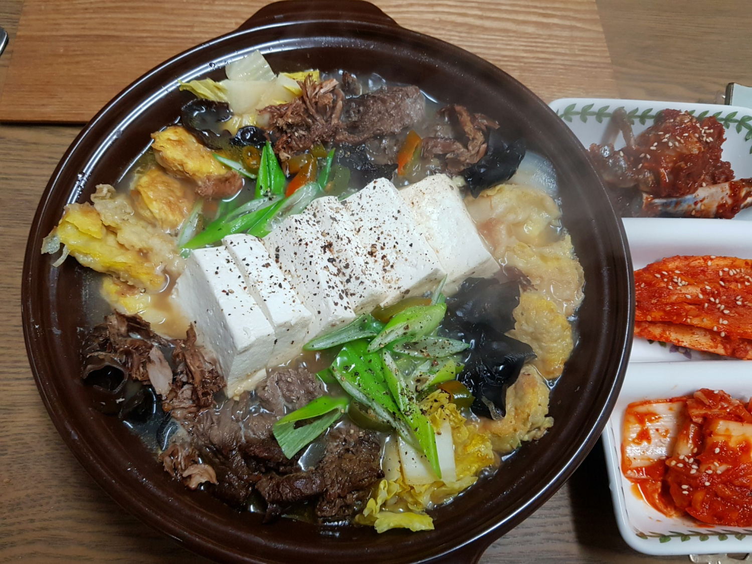 Tuangkan kuah hangat yang sudah dibumbui dengan hati-hati ke atas bahan-bahan yang ditata di panci atau ttukbaegi Anda. Pastikan bahan-bahan terendam sepenuhnya dalam kuah.