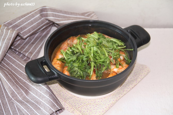Saat udang berubah warna menjadi merah muda yang cerah, ambil kuah dengan sendok dan siramkan di atas bahan-bahan, lalu masak lagi selama 1-2 menit. Potong halus cabai rawit dan tambahkan sekarang untuk memberikan rasa pedas yang menyenangkan pada sup. Hati-hati jangan terlalu matang, karena bisa membuat kuah menjadi keruh.