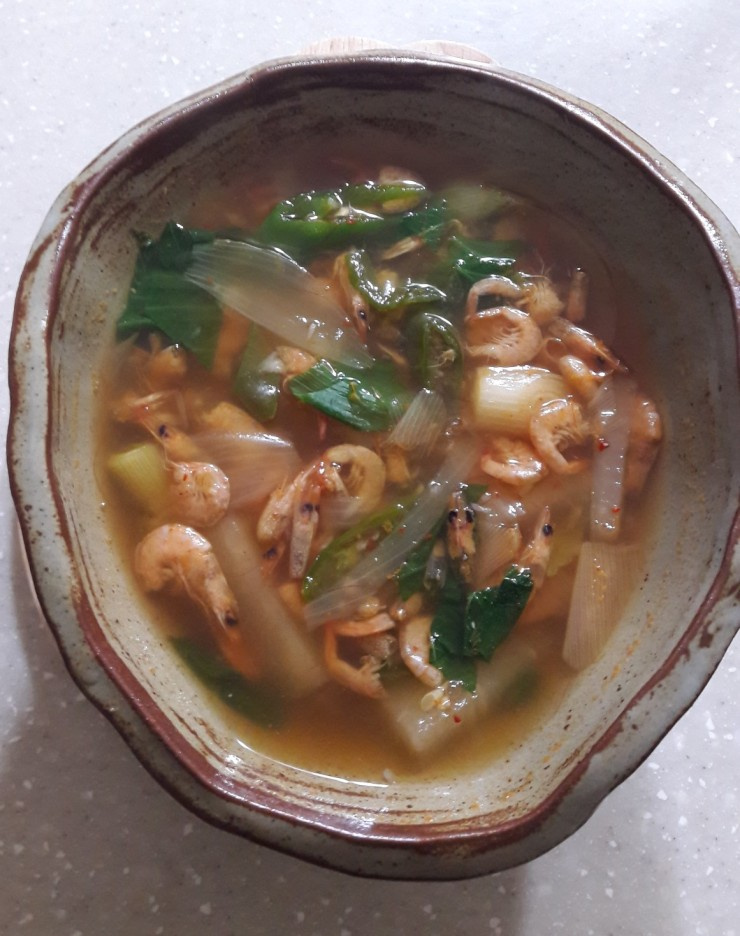 Terakhir, tambahkan cabai, daun bawang, dan daun perilla yang sudah disiapkan. Didihkan perlahan sebentar lagi agar sayuran aromatik menyatu dengan kaldu. Sup udang lezat Anda sekarang siap!