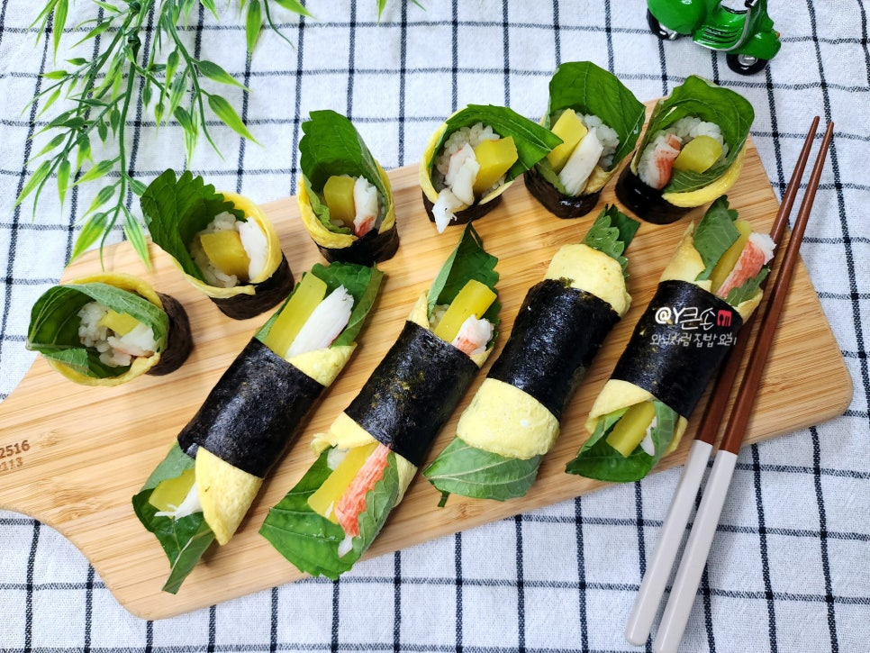 Saatnya merakit gimbap. Letakkan selembar telur dadar di atas potongan rumput laut kecil, diikuti setengah lembar daun perilla, dan lapisan tipis nasi berbumbu. Di atasnya, tambahkan acar lobak kuning dan crab stick. Berhati-hatilah agar tidak mengisi terlalu penuh, karena ini bisa membuat gimbap pecah saat digulung.
