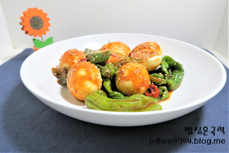 Ketika cabai hijau Korea mulai sedikit melunak, tambahkan telur rebus. Memotong telur menjadi dua dapat membantu telur menyerap lebih banyak rasa, tetapi berhati-hatilah karena telur bisa mudah pecah. Masak dengan api sedang-tinggi hingga saus mengental dan melapisi bahan-bahannya.