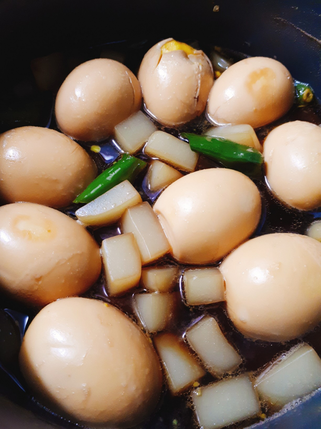 Setelah bumbu mendidih, masukkan telur yang sudah dikupas dan masak dengan api besar selama 10 menit. Balik telur sesekali agar bumbu merata di seluruh permukaan telur.