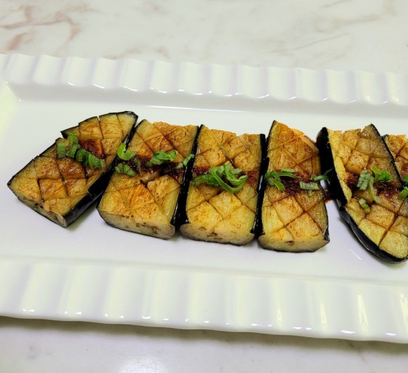 Tata potongan terong panggang yang sudah matang di atas piring saji. Siramkan saus yang sudah disiapkan secara merata di atas terong. Saus akan meresap ke dalam goresan, memberikan rasa yang luar biasa dari dalam ke luar.