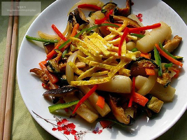 → Setelah bawang bombay dan jamur shiitake harum, masukkan irisan labu kering dan wortel yang sudah direndam. Tumis hingga sayuran mulai lunak. Masukkan kue beras yang sudah dilumuri minyak wijen dan semua bumbu yang disiapkan. Aduk rata hingga semuanya tercampur dan terbalut bumbu. → Tepat sebelum selesai, masukkan irisan cabai dan tumis sebentar. Tambahkan beberapa tetes minyak wijen lagi sebelum diangkat dari api untuk menambah rasa. Hiasi dengan telur dadar yang sudah diiris tipis. Pindahkan ke piring saji dan akhiri dengan taburan lada hitam atau biji wijen, jika diinginkan.