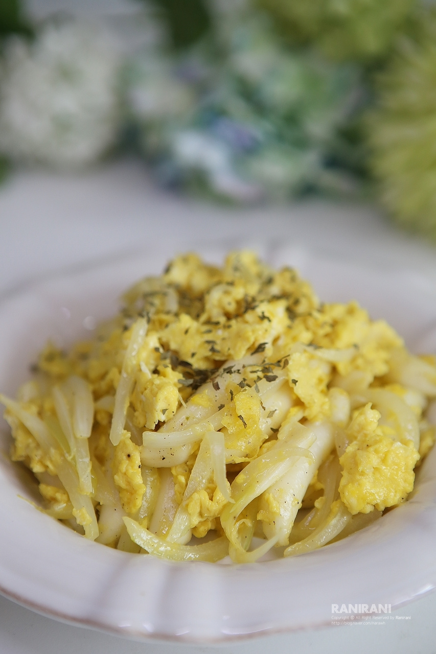 Ketika kue beras dan bawang bombay sudah ditumis dengan baik, kecilkan api. Tuang campuran telur kocok secara merata ke atas bahan-bahan di wajan. Saat telur mulai matang, aduk dan orak-arik perlahan seperti membuat telur orak-arik. Ini akan menciptakan lapisan lembut yang melapisi kue beras dan bawang bombay.