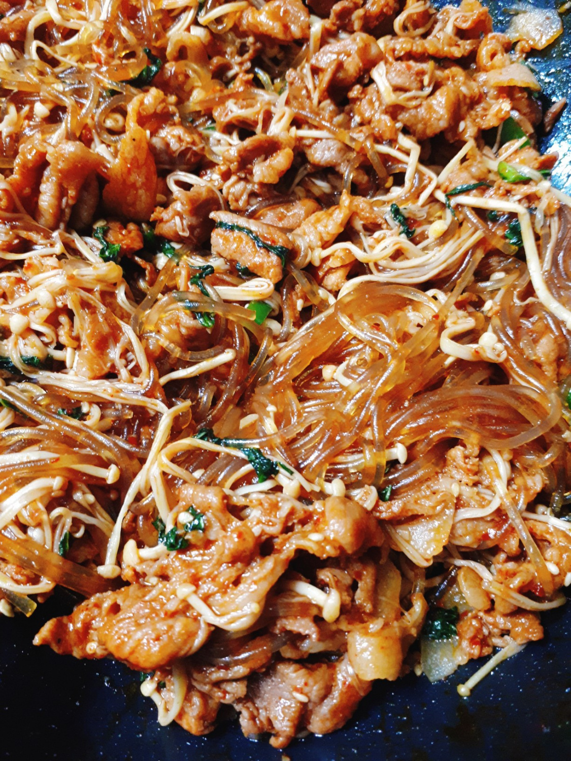 Hidangan ini menampilkan irisan tipis daging babi bagian bahu, dimarinasi dalam saus gochujang yang gurih dan pedas, kemudian ditumis dengan mie kaca kenyal dan jamur enoki yang melimpah. Cocok sebagai lauk pendamping nasi atau teman minum yang lezat!