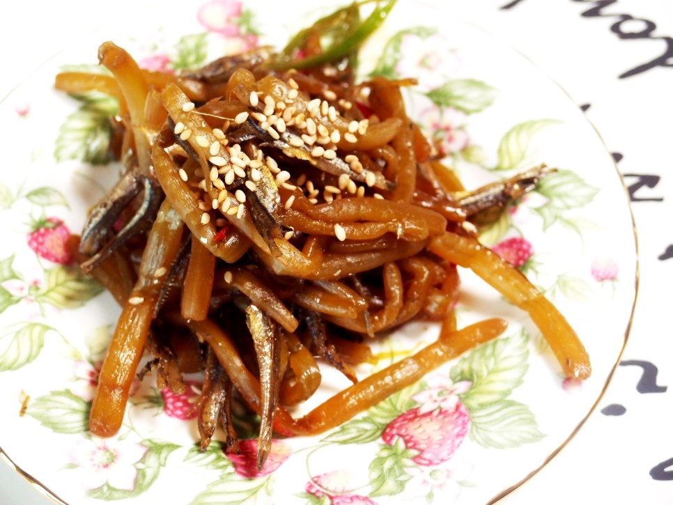Terus didihkan hingga teri mengeluarkan rasa dan saus mengental, melapisi batang ubi jalar dengan baik. Selama proses perebusan ini, tambahkan irisan cabai merah dan Cheongyang dan biarkan matang bersama. Rasa pedas yang ditambahkan akan meningkatkan rasa keseluruhan.
