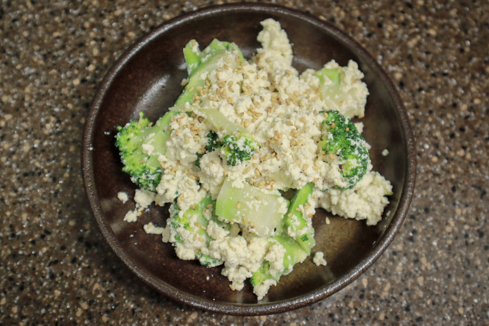 Dalam mangkuk besar, campurkan brokoli yang sudah ditiriskan dan tahu. Tambahkan bahan bumbu: 1 sdm minyak wijen, 1 sdm biji wijen sangrai, 1/3 sdm garam, dan sejumput lada hitam. Gunakan tangan Anda atau spatula, aduk semua bahan dengan lembut, sedikit hancurkan tahu sambil diaduk, pastikan brokoli dan bumbu tercampur merata. Hati-hati jangan sampai tahu terlalu hancur; aduk dengan lembut.