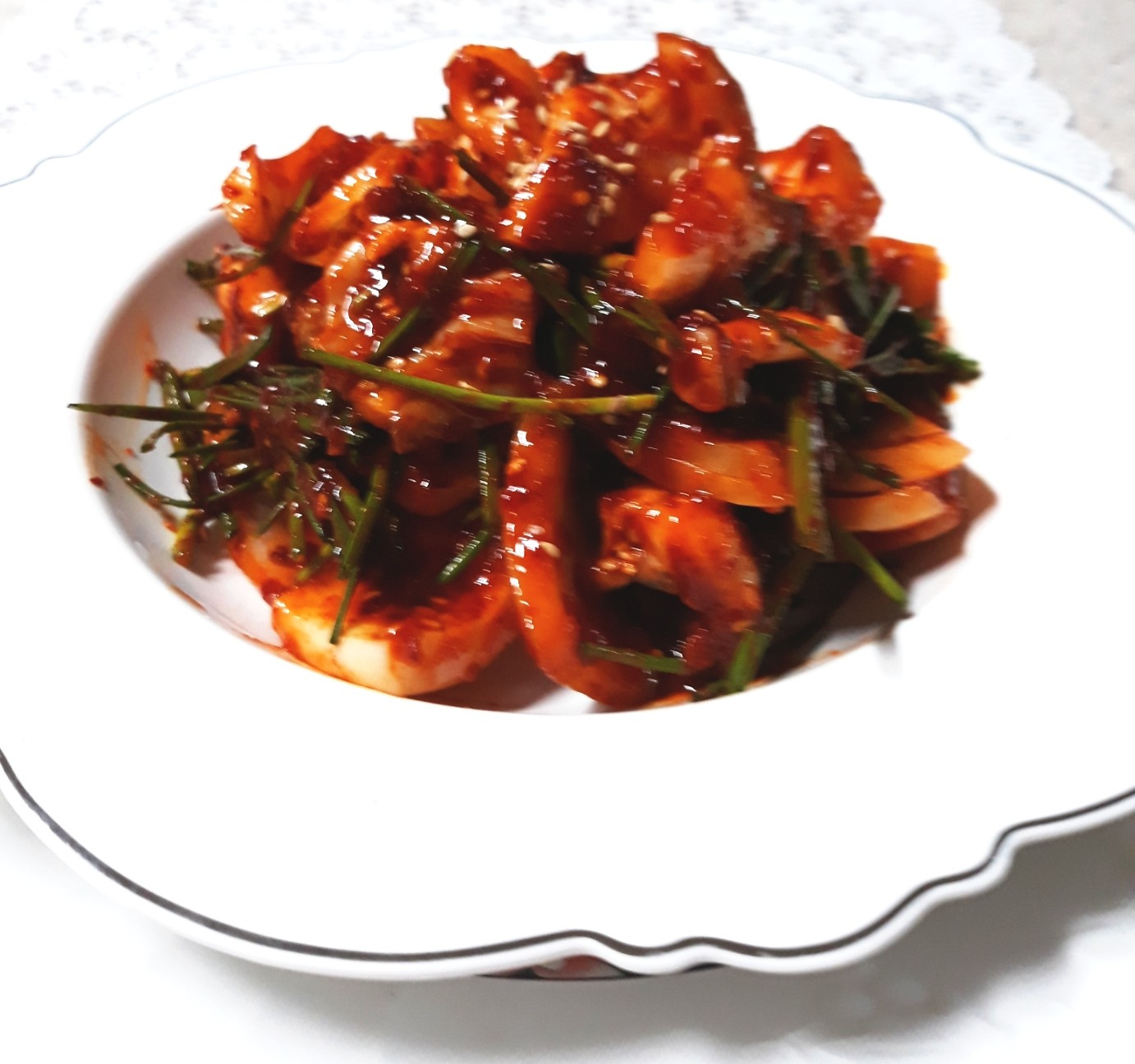 Dalam mangkuk besar, campurkan cumi-cumi yang sudah dipotong, bawang bombay yang sudah ditiriskan, dan daun bawang kucai yang sudah dipotong. Tuangkan saus bumbu yang sudah disiapkan di atas bahan-bahan. Aduk perlahan dengan tangan agar bumbu merata ke seluruh bahan. Hati-hati jangan mengaduk terlalu kuat, karena bisa membuat bahan-bahan hancur.