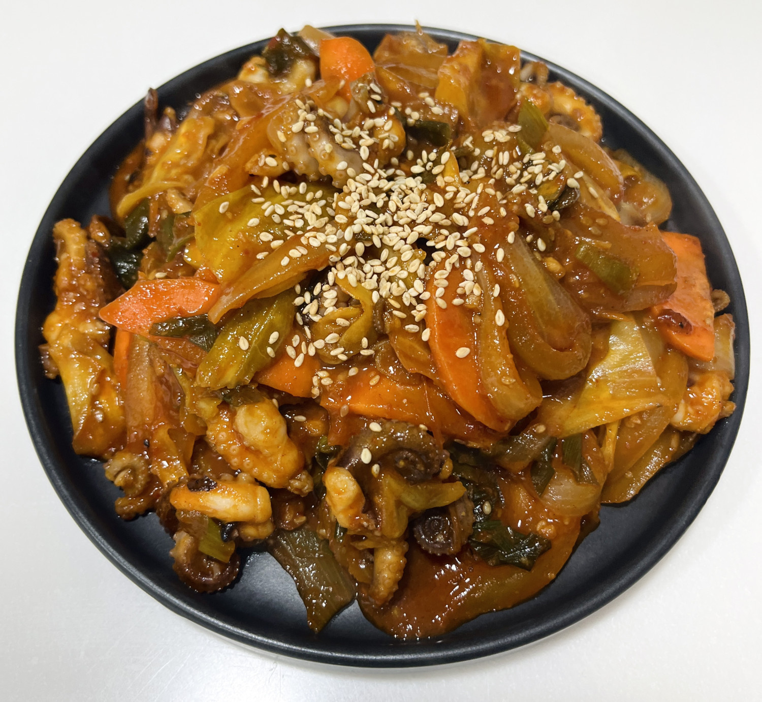 Ketika semua bahan matang dan saus telah melapisi semuanya dengan indah, matikan api. Selesaikan dengan menaburkan 1 sendok makan biji wijen sangrai dan gerimiskan 1 sendok makan minyak wijen untuk menambah rasa dan kilau. Tumis cumi pedas manis Anda siap! Sangat lezat disajikan di atas semangkuk nasi hangat.
