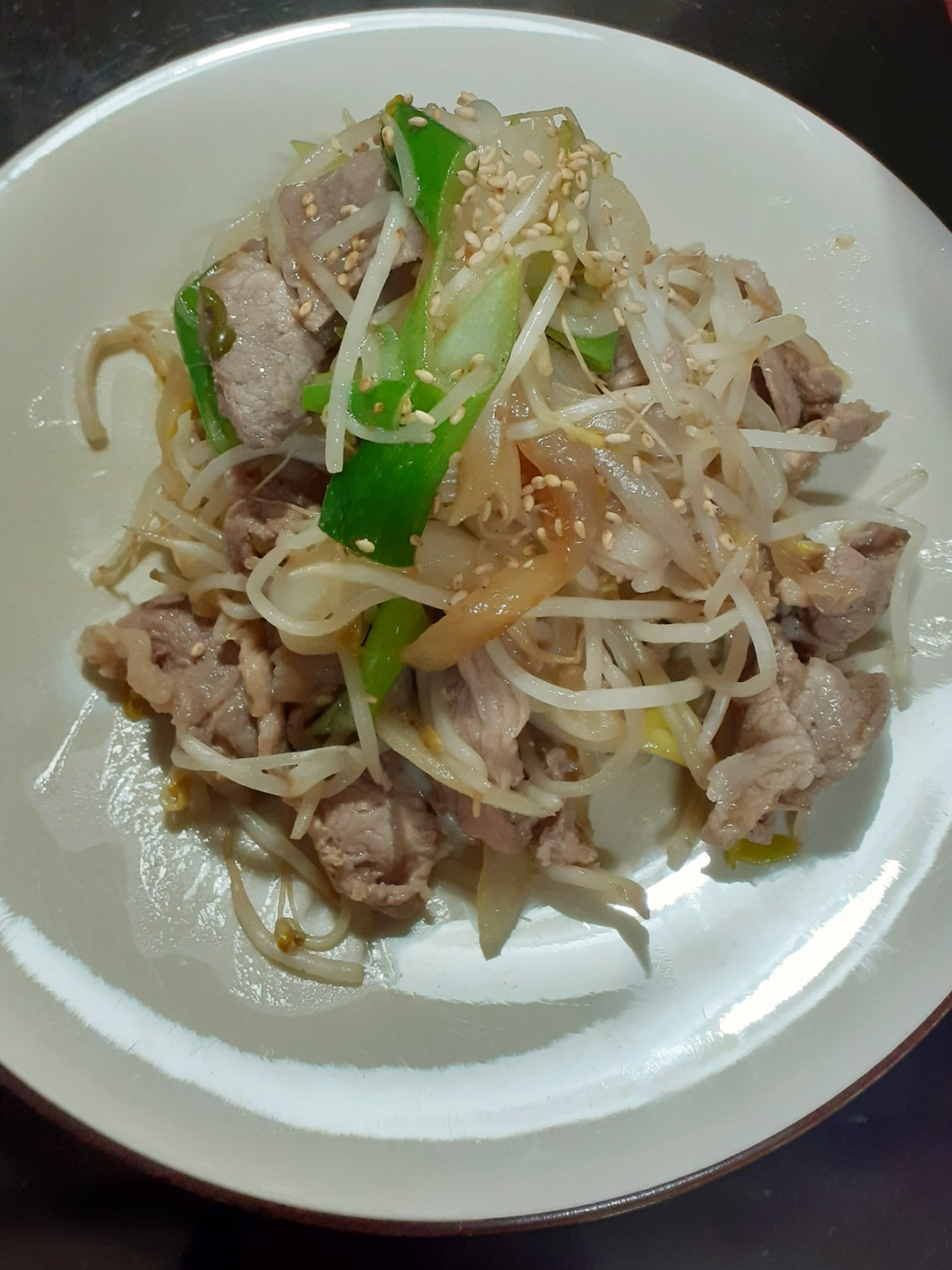 Terakhir, tuangkan 1 sdm minyak wijen dan sejumput lada hitam. Aduk sekali lagi hingga tercampur rata. Pindahkan tumisan daging babi dan tauge yang lezat ke piring saji dan taburi dengan biji wijen untuk rasa kacang tambahan. Nikmati hidangan lezat ini dengan semangkuk nasi hangat!