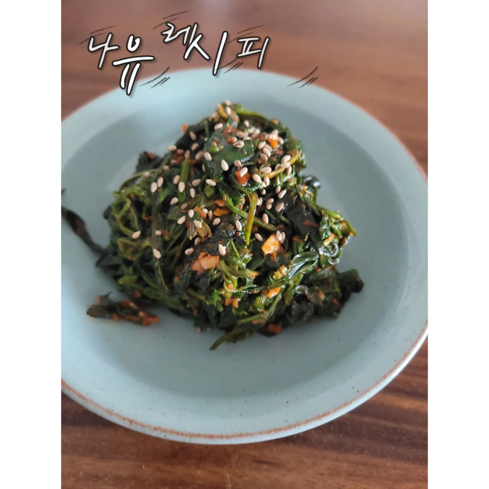 Sekarang, mari kita buat bumbu yang lezat! Masukkan daun cabai yang sudah diperas ke dalam mangkuk pencampur. Tambahkan 1 sendok makan bawang putih cincang dan 1 sendok makan sirup buah plum manis (maesilcheong).