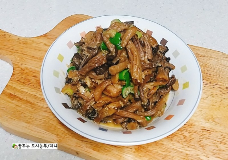Panaskan 2 sendok makan minyak perilla di wajan dengan api sedang. Masukkan jamur tiram yang sudah diperas dan tumis hingga sedikit kecoklatan. Kemudian, tambahkan 1 sendok makan bawang putih cincang, 1 sendok makan kecap asin untuk sup, dan 1/2 sendok makan Dasida, lalu aduk terus hingga harum.
