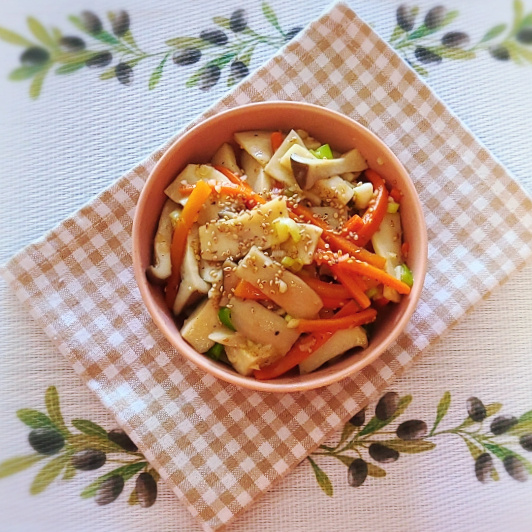 Pertama, potong bagian bawah jamur tiram raja. Belah jamur menjadi dua memanjang, lalu iris-iris ketebalan sekitar 2-3 mm agar mudah dimakan. Iris wortel tipis-tipis memanjang (julienne).