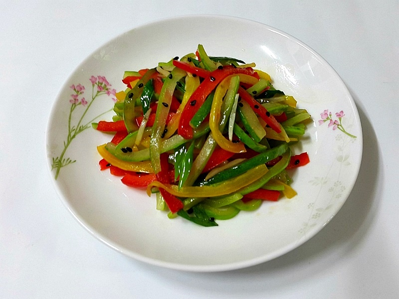 Mempersembahkan hidangan tumis yang cerah dan lezat, menampilkan paprika dan timun, yang memanjakan mata sekaligus lidah. Hidangan ini menawarkan tekstur renyah yang nikmat, dicapai dengan menumis sebentar bahan-bahan yang juga lezat disantap mentah. Ini adalah resep unik yang menonjolkan keindahan warna-warni dan tekstur menarik dari produk segar, menjadikannya lauk yang sempurna dan menarik untuk hidangan apa pun.