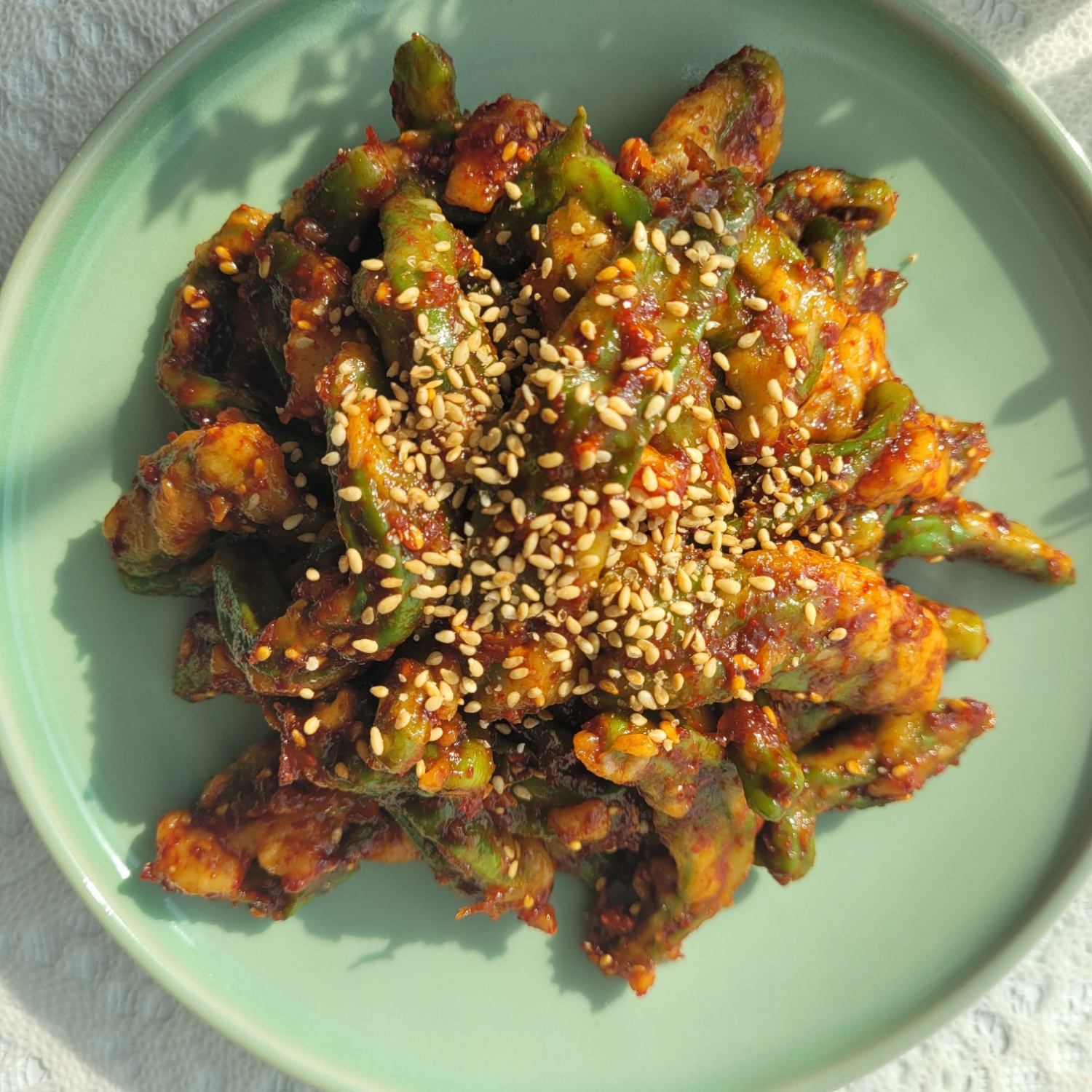 Melapisi paprika hijau dengan tepung lalu mengukusnya menciptakan tekstur kenyal yang luar biasa nikmat saat digigit. Hidangan ini adalah pendamping paprika hijau yang dibumbui dengan saus pedas dan manis yang seimbang sempurna, menonjolkan cita rasa terbaiknya. Ini benar-benar menggugah selera!