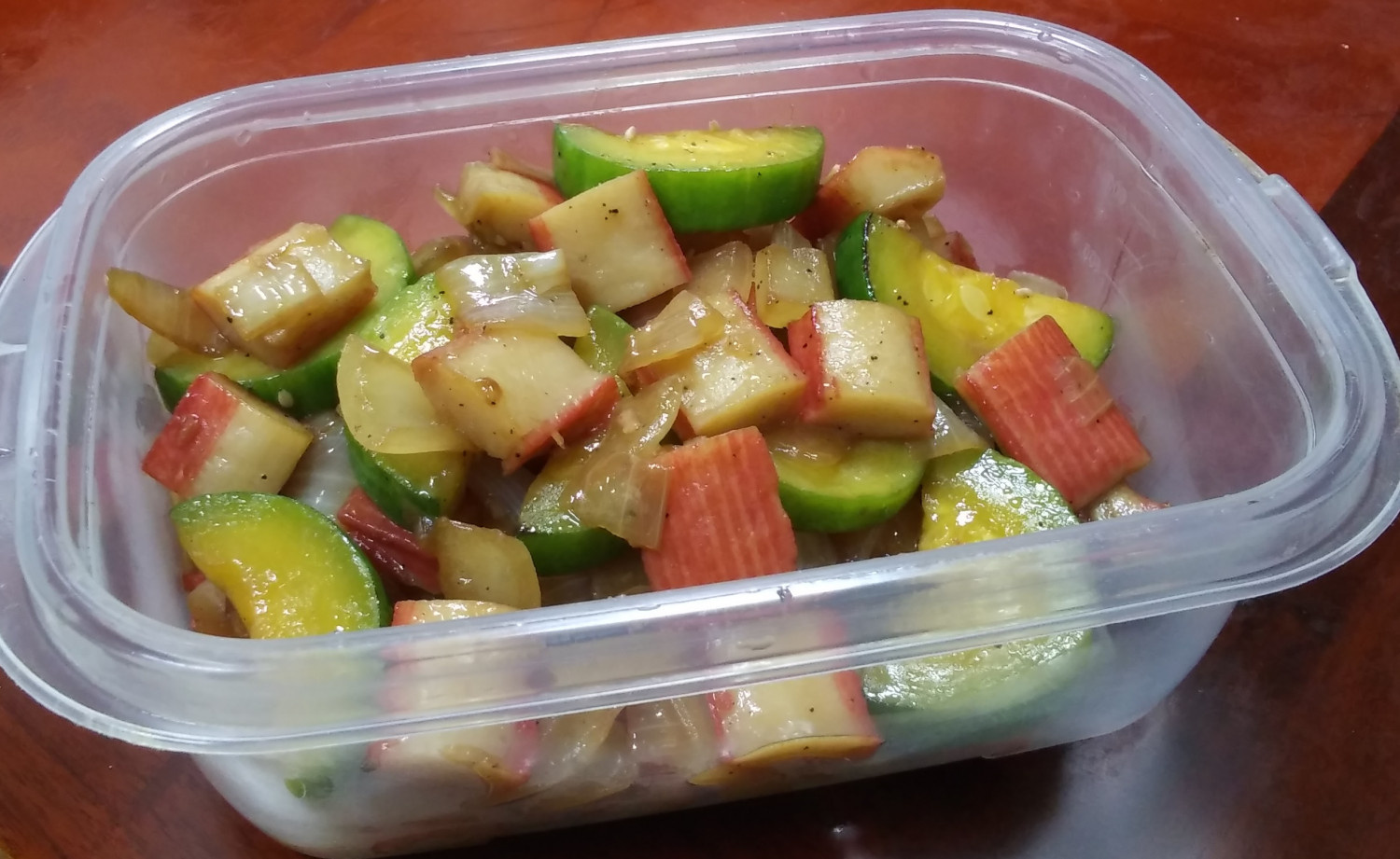 Pertama, siapkan semua bahan. Potong stik kepiting menjadi ukuran sekali suap, sekitar 1.5 cm lebarnya. Iris bawang bombay agak tebal memanjang, dan potong zukini bentuk setengah lingkaran atau memanjang. Memotong sayuran tidak terlalu tipis akan membantu menjaga teksturnya tetap enak saat ditumis.