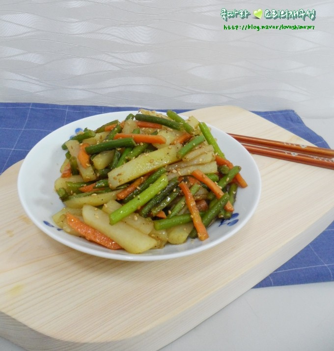 Potong ujung rebung bawang putih dan potong menjadi panjang yang sama dengan irisan kentang. Buang bagian ujung yang keras, dan jika batangnya tebal, Anda bisa membelahnya menjadi dua memanjang agar bumbu lebih meresap. Potong wortel menjadi irisan dengan panjang yang sama dan ketebalan sekitar 0.3 cm, agar memiliki sedikit tekstur renyah.
