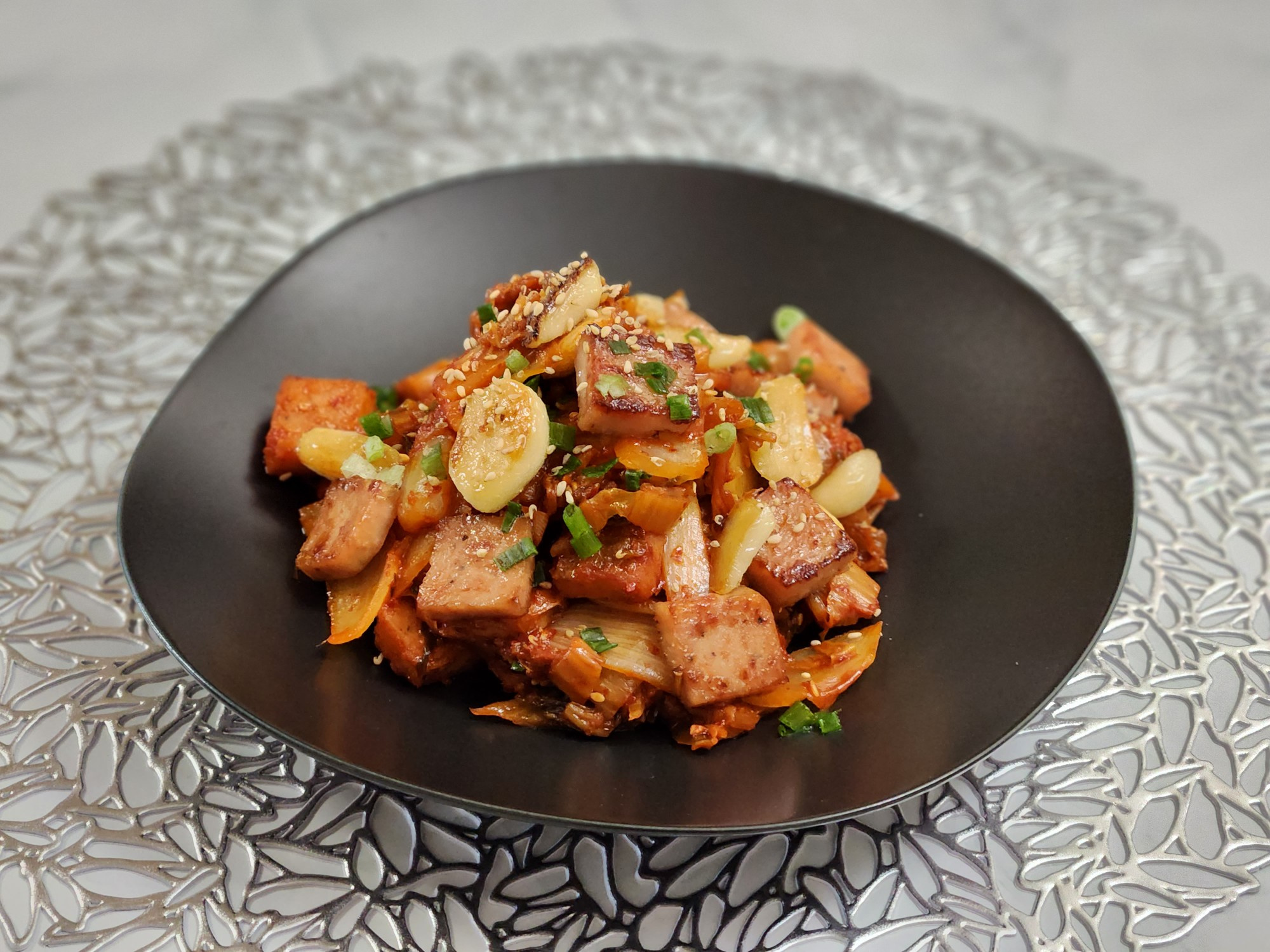 Campurkan semuanya sebentar, dan Tumis Spam dan Kimchi Anda yang lezat siap disajikan! Minyak perilla dan gula menyeimbangkan keasaman kimchi tua dengan indah, menciptakan profil rasa yang akan disukai semua orang. Bawang putih yang dimasak menambahkan rasa manis dan tekstur yang menyenangkan. Tumis kimchi yang manis, gurih, sedikit pedas, dan asam segar ini benar-benar ‘pencuri nasi’! Kimchi itu sendiri sudah cukup beraroma dan pedas, jadi bumbu tambahan tidak diperlukan. Sajikan di atas semangkuk nasi hangat untuk hidangan yang benar-benar memuaskan!