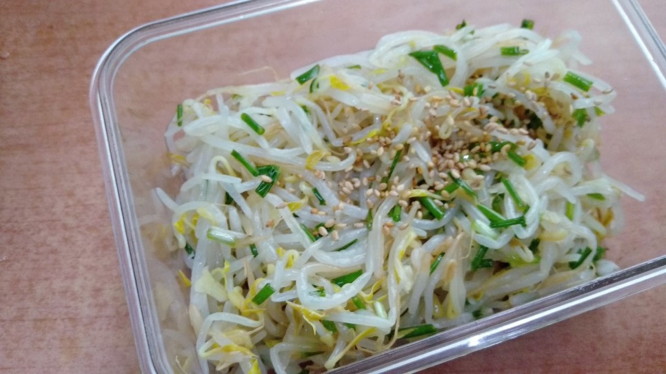 Masukkan tauge mung yang sudah ditiriskan ke dalam mangkuk. Tambahkan semua bahan bumbu yang sudah disiapkan: daun bawang yang sudah diiris (1 batang), bawang putih cincang (1 sdt), garam (2/3 sdt), dan minyak wijen (2 sdt) untuk memberikan rasa gurih yang lezat.