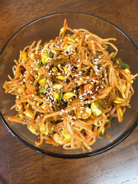 Terakhir, taburkan biji wijen secara melimpah di atasnya untuk aroma kacang yang lebih kaya dan tampilan yang menarik. Tumis tauge Anda yang lezat kini siap disajikan!