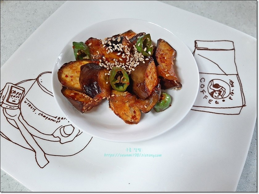 Panaskan 2 sdm minyak goreng di wajan, lalu tumis terong terlebih dahulu hingga agak layu dan mulai transparan. Setelah terong agak matang, saatnya menambahkan bumbu. Campurkan 1 sdm ekstrak buah plum, 1 sdm saus tiram, 1 sdm kecap asin, dan 1 sdm bubuk cabai Korea (gochugaru). Karena saus tiram saja mungkin kurang asin, penting untuk menambahkan kecap asin juga untuk menyeimbangkan rasa secara keseluruhan.