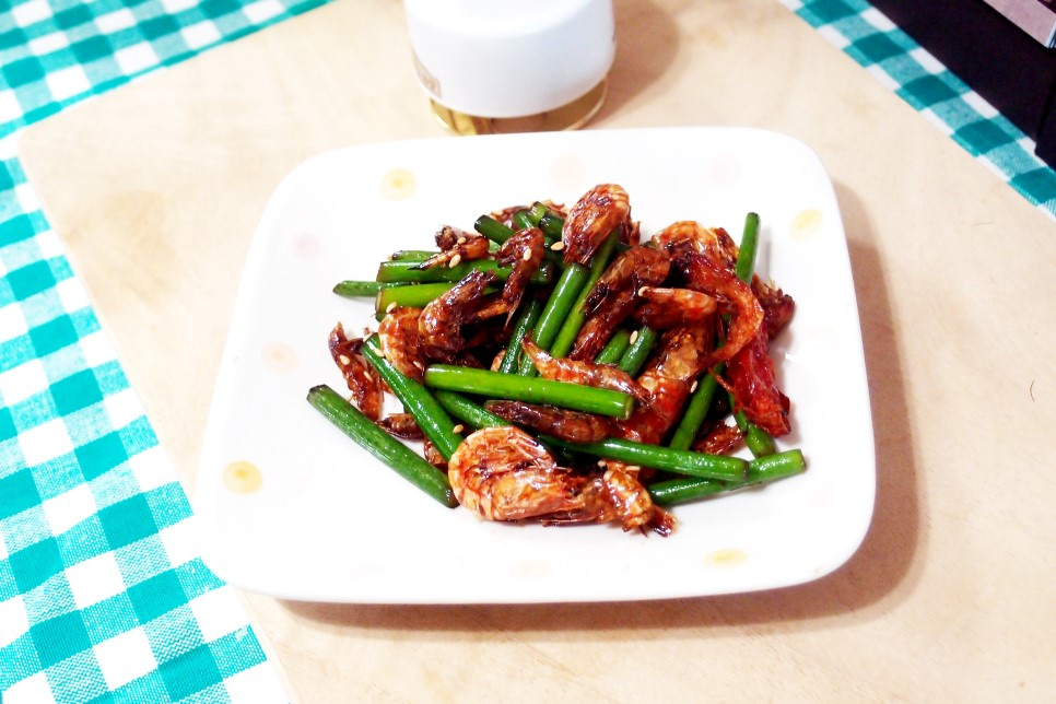 Tumis Udang Merah dan Tunas Bawang Putih (Gaya Sumine Banchan)