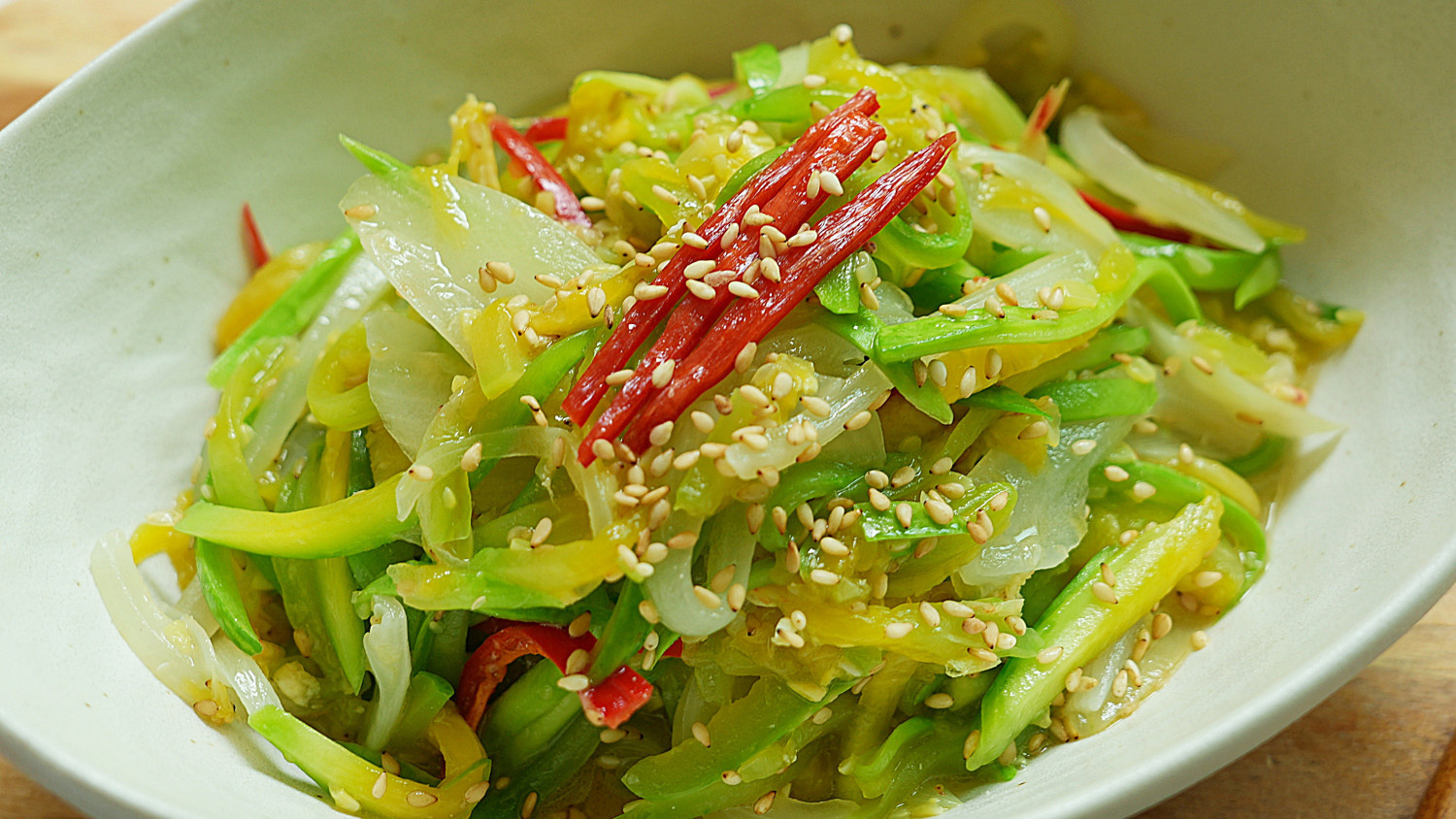 Terakhir, tambahkan irisan cabai merah, 1 sendok makan bawang putih cincang, 1 sendok makan minyak wijen, dan 1 sendok makan biji wijen sangrai. Aduk semuanya dengan lembut hingga tercampur rata. Tumis zucchini iris Anda yang lezat siap disajikan! Anda dapat menyesuaikan rasa dengan sejumput garam jika perlu. Hidangan ini sempurna disajikan di atas nasi hangat atau sebagai lauk bekal yang lezat.
