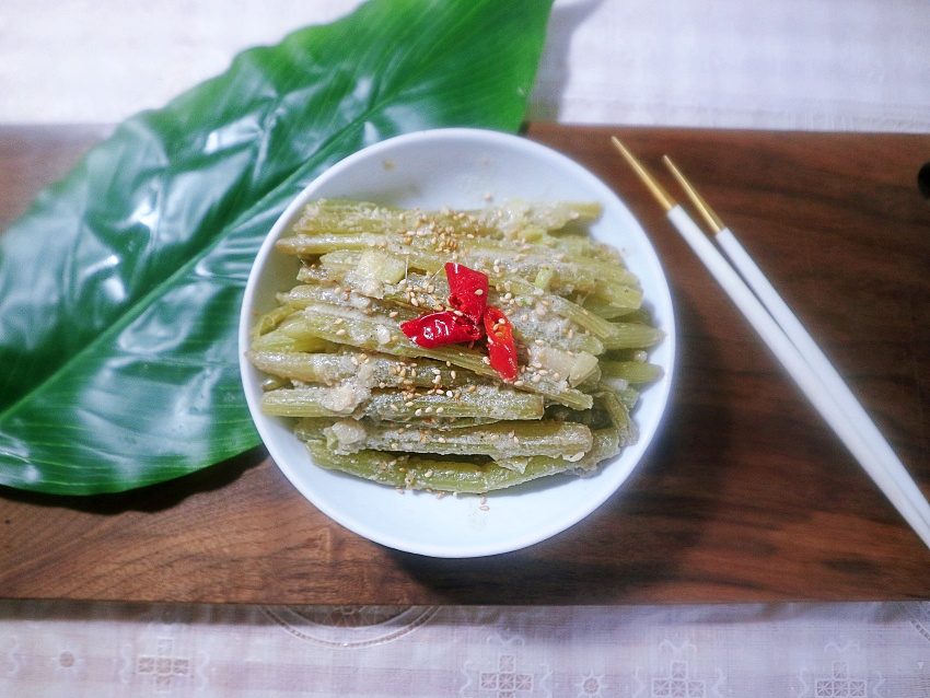 Pindahkan tumisan batang Petasites hybrid yang sudah jadi ke piring saji. Untuk tampilan yang menarik, taburkan biji wijen sangrai dan hiasi dengan irisan cabai merah tipis.