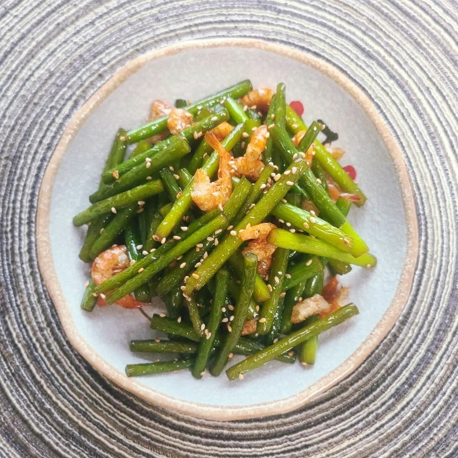 Sekarang, tambahkan 10g udang kering untuk tekstur kenyal. Aduk perlahan dengan rebung bawang putih sebentar saja untuk mencampur. Hati-hati jangan sampai udang terlalu matang karena bisa menjadi keras.