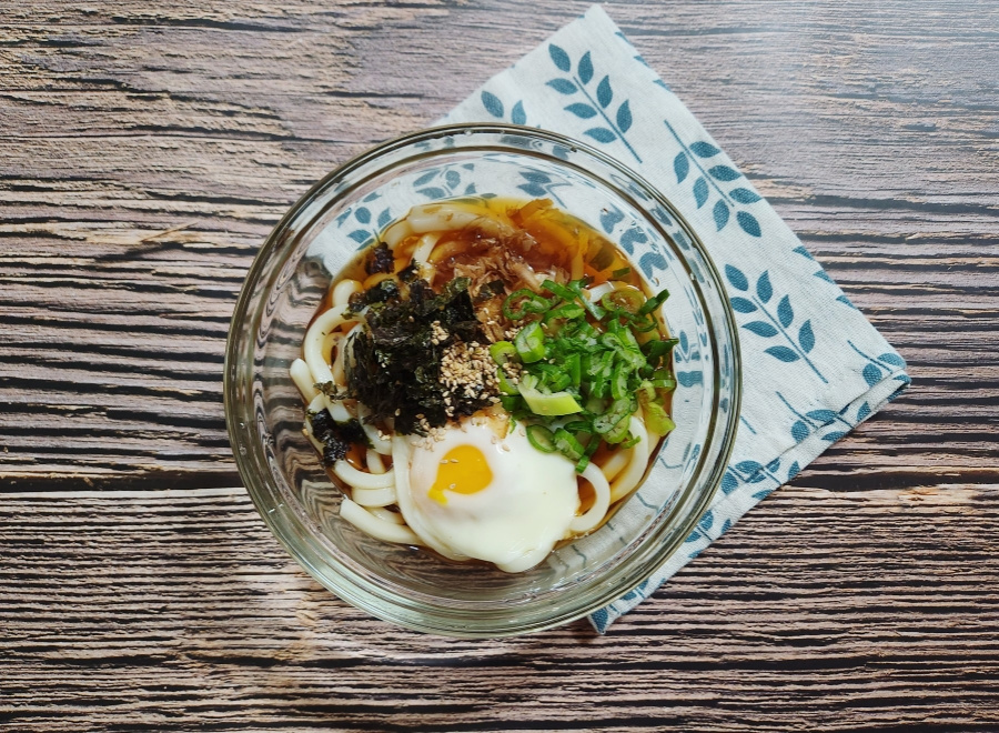 Rakit Udon Bukkake Anda. Letakkan mi udon dingin di mangkuk saji. Tambahkan sekitar satu genggaman kecil katsuobushi per porsi. Letakkan telur rebus dengan lembut di atasnya. Kemudian, taburkan irisan daun bawang dan nori cincang dengan melimpah.