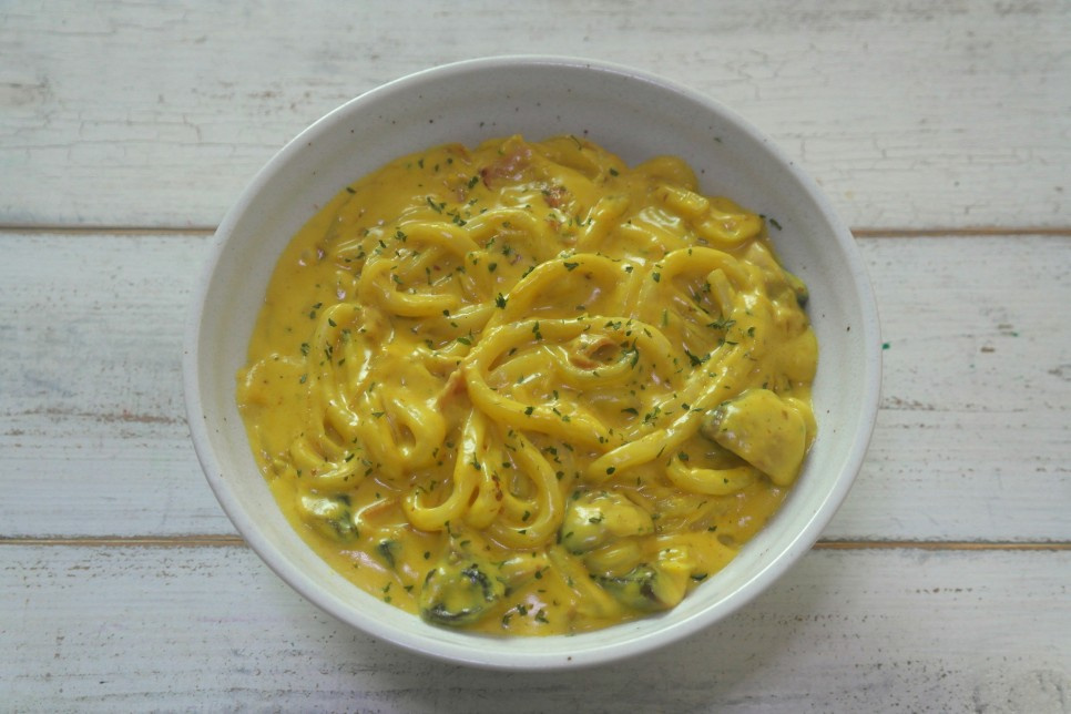 Hari ini adalah hari makan enak sendirian di rumah. Awalnya, ini adalah hari libur bersama ayah, ibu, dan saya, tetapi orang tua saya punya janji dan pergi keluar. Sepertinya itu janji pasangan. Karena tidak banyak hari libur yang sama untuk ayah, ibu, dan saya, saya berpikir untuk membuat sesuatu yang enak hari ini, tetapi akhirnya makan sendiri. Tiba-tiba harus makan sendiri, menu pun berubah. Awalnya saya berencana membuat Jjimdak (ayam rebus ala Korea) kesukaan ayah, tetapi karena semua bahan sudah disiapkan, rasanya kurang pas jika dibuat hanya untuk saya sendiri. Jadi, saya membuat Udon Kari Krim yang sederhana saja. Saya bertanya-tanya apakah kata ‘sederhana’ cocok saat membuat Udon Kari Krim, tetapi bagi saya, itu sederhana. Sekarang, saya akan segera menunjukkan cara membuat Udon Kari Krim.