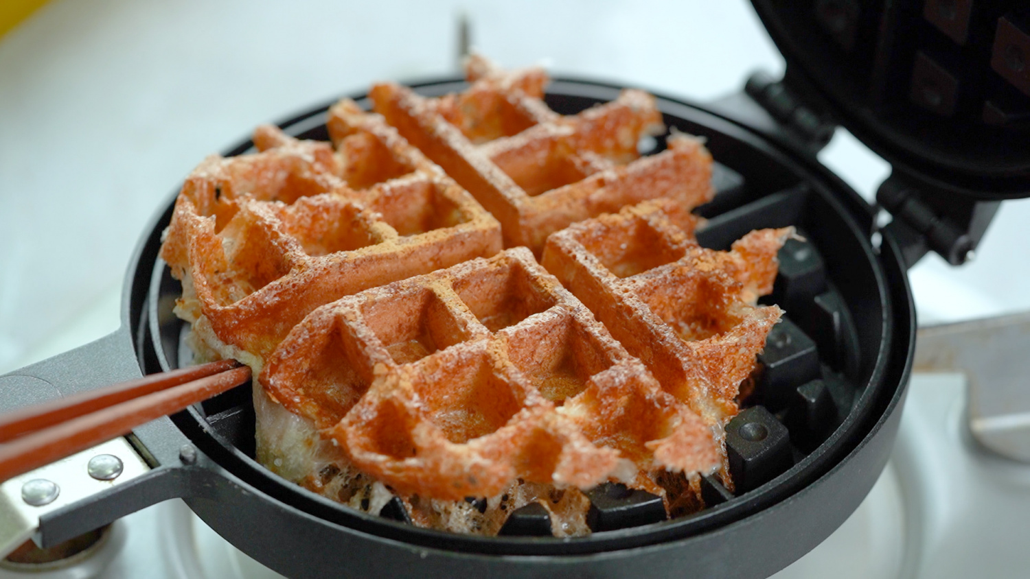 Terus masak hingga potongan injeolmi pipih menyerupai bentuk wafel, berubah warna menjadi cokelat keemasan, dan bagian tepinya menjadi sangat renyah. Kuncinya adalah mencapai kontras sempurna: bagian luar yang renyah dan bagian dalam yang meleleh serta kenyal. Setelah kedua sisi matang merata dan sedikit renyah, Wafel Injeolmi Anda siap disajikan, dengan tekstur kenyal dan aroma yang harum.