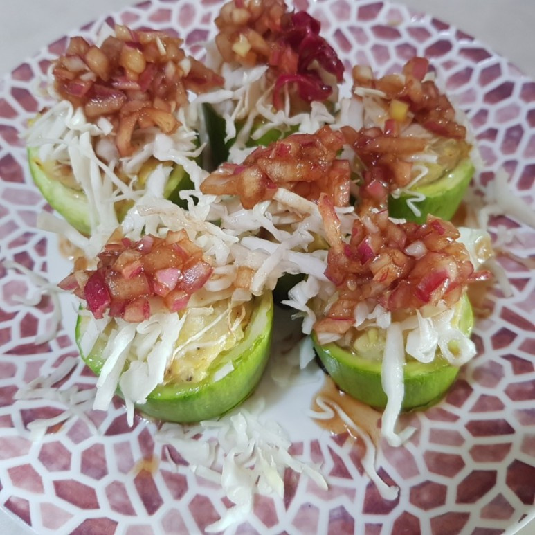 Secara opsional, taburi zucchini yang sudah diisi dengan kol cincang halus atau sayuran cincang halus lainnya untuk sentuhan dekoratif. Setelah diisi dan dihias, masukkan zucchini ke dalam keranjang pengukus dan kukus dengan api sedang selama 20-30 menit, atau hingga zucchini empuk dan isian matang sempurna.