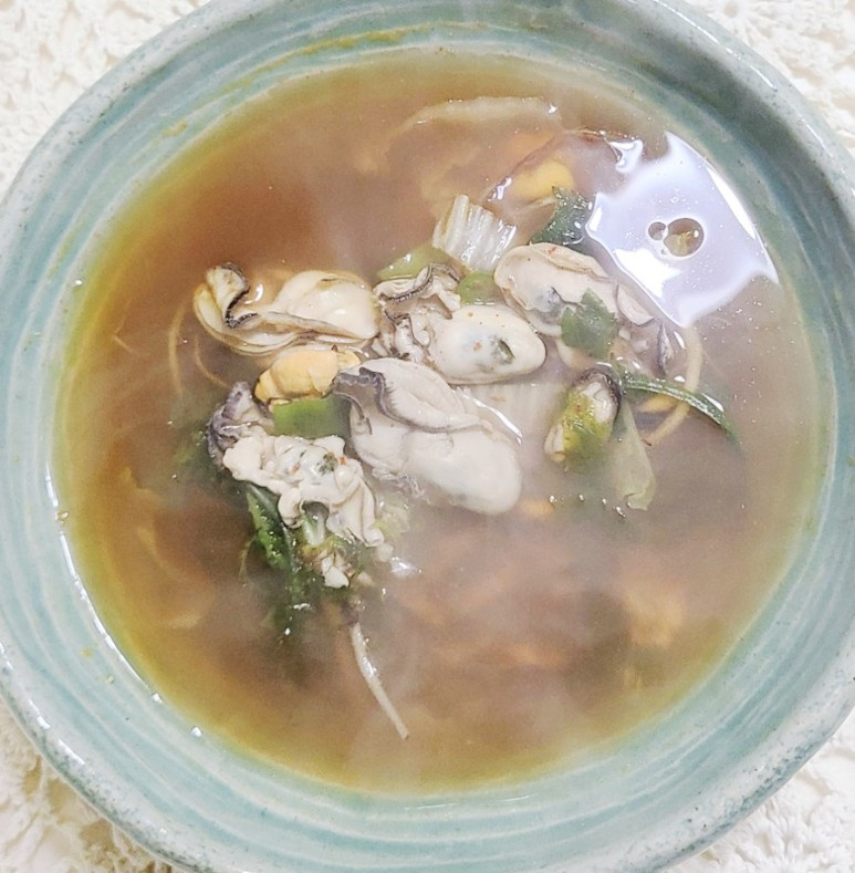 すべての材料と調味料がなじむように、ふつふつと煮立たせたら、深みのある爽やかな牡蠣スープの完成です。熱々のスープを味見しながら、塩加減を調整してください。