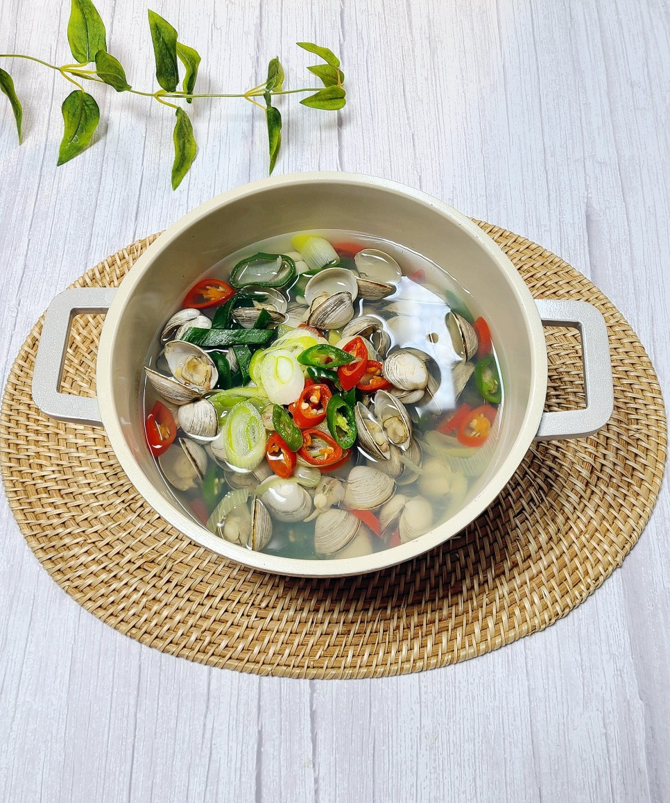 最後に、準備しておいた青唐辛子、赤唐辛子、そして長ネギを加え、さっと一煮立ちさせます。アサリスープは長時間煮すぎるとアサリが硬くなり、風味が飛んでしまうことがあります。強火で、合計10分以内を目安に煮るのがおすすめです。