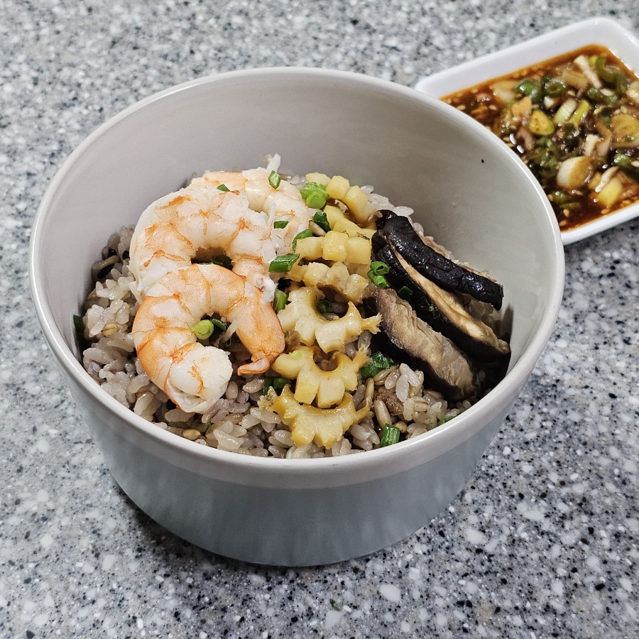 美味しそうな、あわびと海老の栄養満点炊き込みご飯が完成しました!ご飯はもちもち、海老とあわびはぷりぷりに仕上がっているはずです。